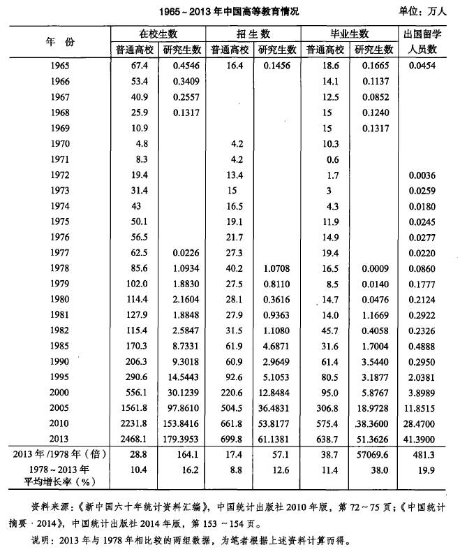 这一长期的人力资本红利表现为( 见下页表) : 与1 9 7 8 年相比, 2 0 1 3 年相当于1 9 7 8年高等学校在校生数的2 8 . 8 倍、研究生在校生数的1 6 4 . 1 倍、出国留学生数的4 8 1 . 3 倍。此外, 笔者估计, 在2 0 世纪7 0 年代初, 中国大学毛人学率仅为0 . 5 % 左右, 1 9 7 8 年也不足1 % , 到2 0 1 3 年, 达到了3 4 . 5 %。这就是说, 按大学毛人学率来计算, 2 0 1 3 年全国大学学龄人口考上大学的机会是1 9 7 8 年的3 0 多倍, 是7 0 年代初的6 0 多倍。与美国相比较, 1 9 8 0 年中国普通高校在校生数只相当于美国的( 1 0 4 7 . 5 万人) 的1 . 6 % , 到2 0 0 5年中国就超过了美国, 到2 0 0 9 年中国相当于美国的1 2 2 % ;1 9 8 0 年中国研究生在校生数( 2 . 1 6 万人) 只相当于美国的( 1 3 4 . 3 万人) 的1 . 6 % , 到2 0 0 7 年中国( 1 1 9 . 5 0 万人) 相当于美国( 2 2 9 . 4 万人)的5 2 . 1 % , 2 0 1 3 年中国达到了 1 7 9 万人, 估计到2 0 1 5 年左右中国会超过美国。