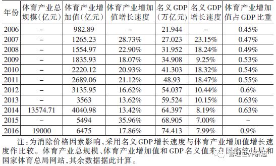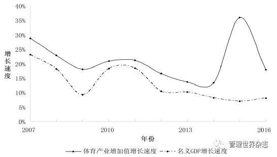 从图1和表1可以看出,过去10年中国体育产业增加值增长速度一直显著高于GDP的增长速度。其中从第一阶段从2007~2012年,体育产业增加值增长速度高于GDP增长速度,大约为GDP增长速度的2倍,两者差距在这个期间相对稳定。第二阶段从2013~2016年,GDP增速放缓,而体育产业增加值继续加快,两者差距迅速扩大,2014~2016年,体育产业增加值年均增长速度高达26.6%,接近同期GDP增长速度的4倍。