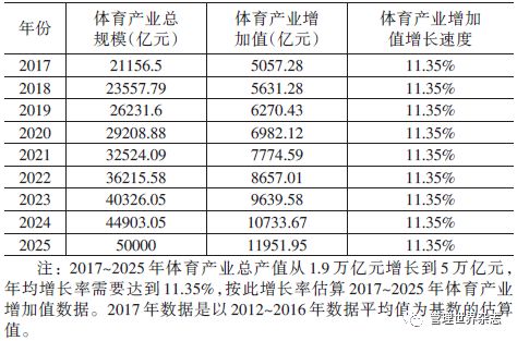 再往后5年,“到2025年中国的体育产业产值达到5万亿”这个目标也有望实现。因为只需从2016年起年均增长率达到11.4%即可(见表4)。这个速度远低于现在体育产业产值的年均增长率。