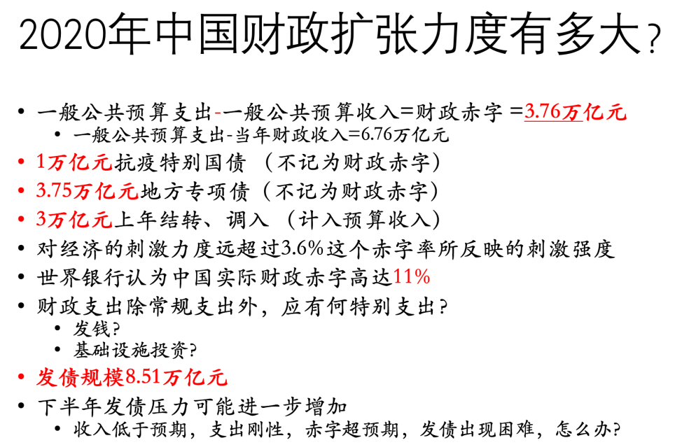 概括来说我们可以看到,2020年我们的一般公共预算赤字为3.76万亿,这是用来刺激经济增长的;政府发放了1万亿的特殊国债,也是用来刺激经济增长的。另外地方政府发放了3.75万亿专项债搞基础设施投资,它和抗疫特别国债虽然不计入财政赤字,但也会对经济增长起到刺激的作用。还有刚才已经提到,有3万亿是从上年结转调入放到今年的财政预算收入中去的,所以3.76加上1万亿再加上3.75万亿,总发债规模就达到了8.5万亿。要算经济扩张的力度,这三者都要加到一起来。把这一总和再拿去跟GDP相比,财政赤字率就不再是3.6%了,世界银行认为特别国债、专项债都应该算作为弥补财政赤字由政府发行的债务。按照世界银行的广义赤字的概念,中国的实际财政赤字高达11%。意思就是如果下图中所有红字内容都算作是一种扩张性、刺激性支出的话(类似财政赤字的一种概念),则中国实际财政赤字占GDP的比例是11%,而不是3.6%。