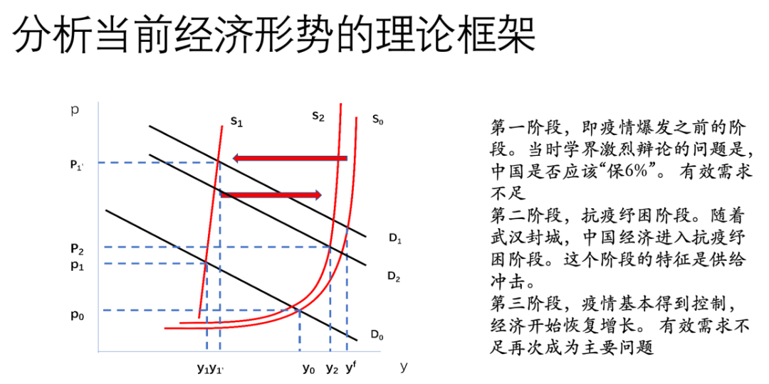 概括来说,从去年年底到现在,我们一共经历了三个发展阶段。第一个阶段是总需求不足;第二个阶段是由于受到疫情的冲击(主要是供给侧的冲击),我们的产出水平急剧下降,物价水平也有所下跌。而现在,由于疫情基本得到控制,我们也就进入了第三个阶段。在这一阶段,我们的供给能力基本得到了恢复,需要采取扩张性的财政货币政策,来让需求能够得到足够的扩张,使经济增长速度能尽可能地回到潜在经济增长速度所允许的水平上。