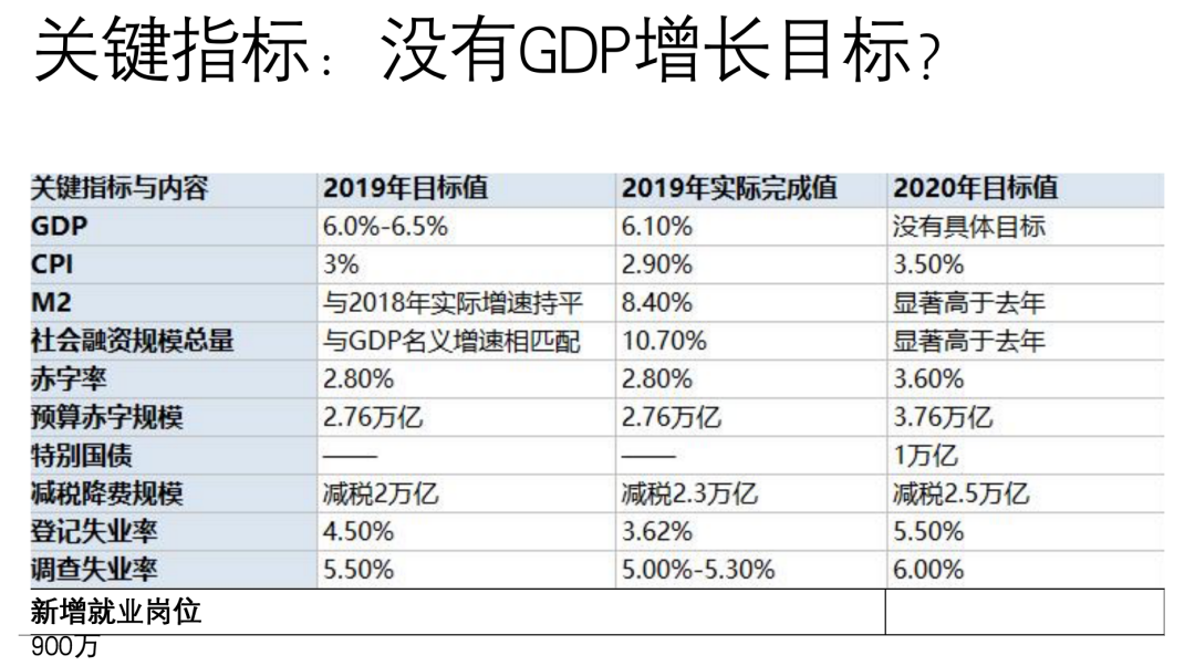 实际上刚才我也说过,我们有一个隐含的经济增长目标。根据国家发改委、财政部等给出的数据,今年赤字规模预计达到3.76万亿,从中我们可以推断出,2020年GDP的名义增速目标约为5.4%,注意是名义GDP。政府并没有明确通货膨胀的目标是多少,而是给出了CPI和通货膨胀率的预测数值。