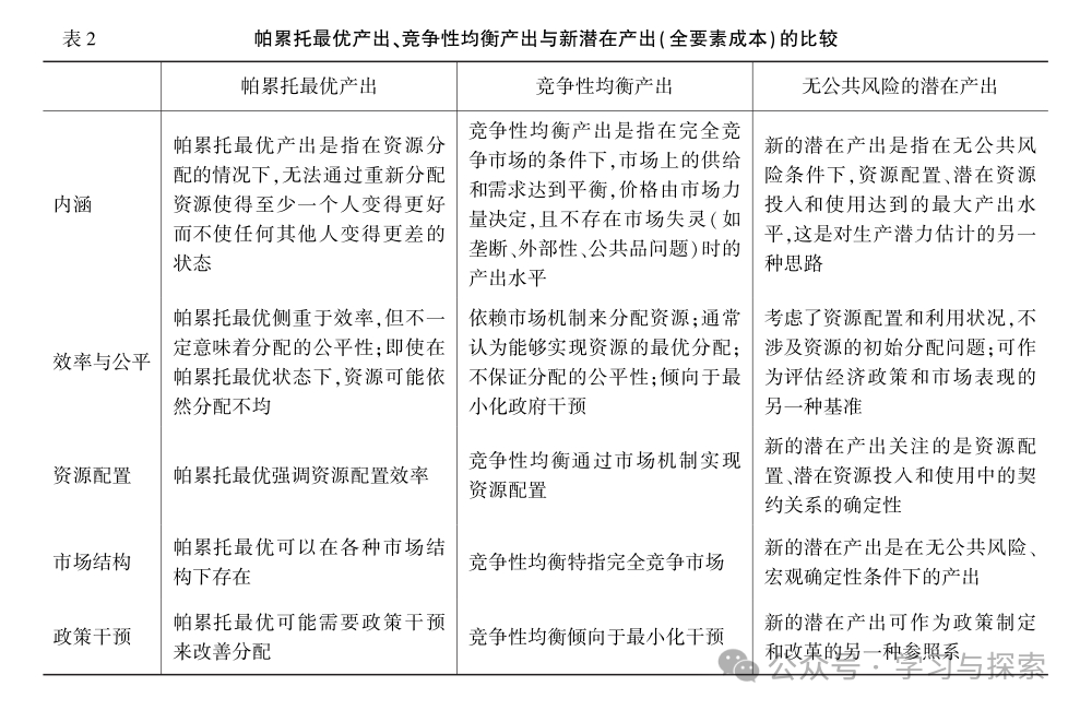 第六,全要素成本的底层逻辑是宏观不确定性,区别于帕累托最优和竞争性均衡(见表2)。经济运行以社会稳定为前提,市场运行以宏观经济基本稳定为条件,这些前提条件可被概括为“宏观确定性”,即设定的公共风险水平为零,不会扰动经济运行。帕累托最优分析和竞争性均衡分析的底层逻辑是基于宏观确定性的假设。而全要素成本的分析恰恰是打破这个假设,充分考虑宏观不确定性(极端情形是战争和社会动荡),即公共风险对经济运行和增长的影响。公共风险包括了自然风险、经济风险、政治风险、社会风险和外部风险等不同维度的公共风险,所以全要素成本的分析是多维度的风险集合分析,是从未来看现在,跳出了市场选择和竞争过程本身。
